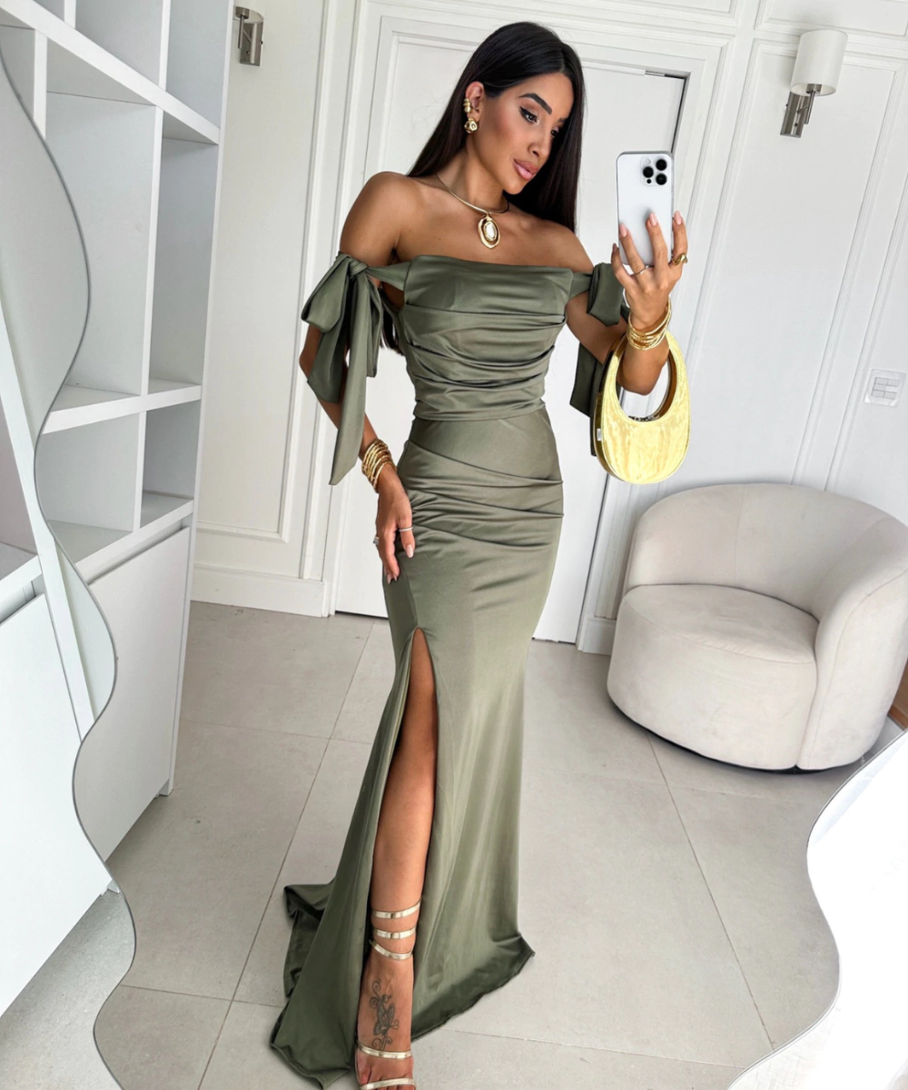 Vestido confeccionado no tecido acetinado, ombro a ombro com amarração, podendo ser ajustada. Contem drapeado na frente e atras. Possui bojo e forro.
