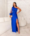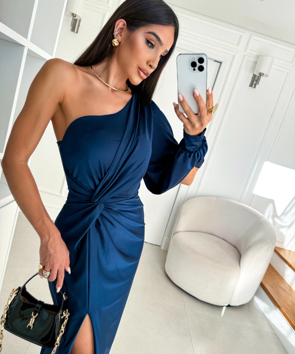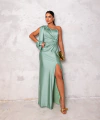 Vestido longo em tule em malha trilobal, ombro só, manga longa vazada, detalhe em torcido na cintura com um leve drapeado.