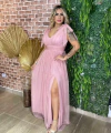 Confeccionado em tule com glitter, o vestido proporciona um toque de sofisticação e glamour. Possui bojo e forro, garantindo conforto e segurança ao vestir. O zíper nas costas facilita o uso, enquanto a saia solta e fluida com fenda traz movimento e leveza à sua silhueta.
